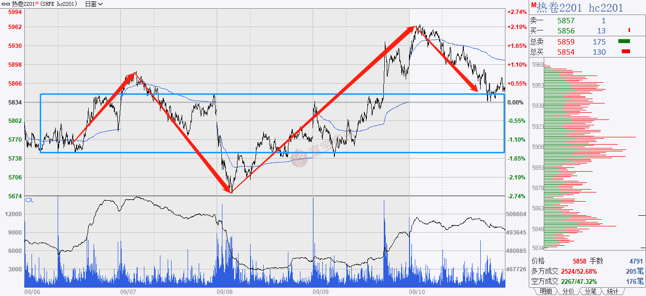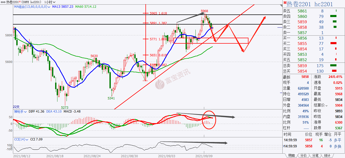 本周熱卷期貨主力合約整體呈現(xiàn)震蕩走強特征。上周五夜盤開盤沖擊第一壓力位5891未果,走出快速下跌,周二夜盤跌至5674,后快速回升,在周三早盤重上小周期MA13線,醞釀出一波強勢反彈行情,在逐步擊破阻攔線后,周四午盤突破5891,經(jīng)過短形態(tài)震蕩,價格沖高至第二壓力位5965附近,打出本周高點5968,周五承壓回落,走出結(jié)構(gòu)性調(diào)整行情,K線在位于一小時周期的MA13線附近,收調(diào)整之力,弱勢震蕩于此收盤。